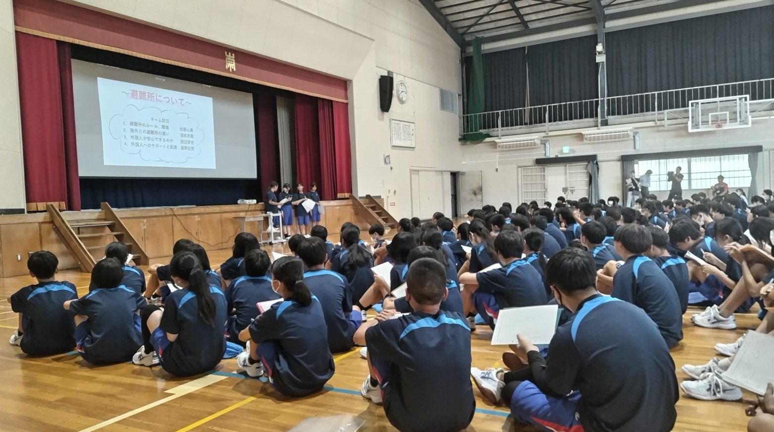 崇中1年生の総合学習で、国語、数学、理科1,2、社会1,2、英語、保健体育の8つの教科でグループに分かれ、防災をテーマに調査・討議・まとめ行うにあたって、「平芝自治区が防災に関する取り組みをしっかり行っているのでアドバイザーとして参加してほしい」と崇中より依頼があり、4役、評議員が過去2回の授業に参加しアドバイスを行ってきました。
