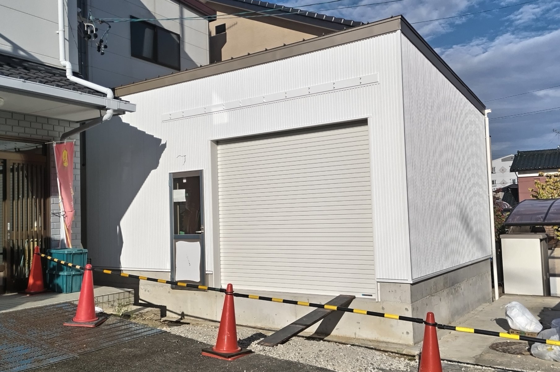 8月23日(土)の基礎工事完成後進めていた倉庫本体の工事が9月26日(金)に完成。足場もきれいに撤去されました。この後は倉庫周りの土間工事が予定されています。
