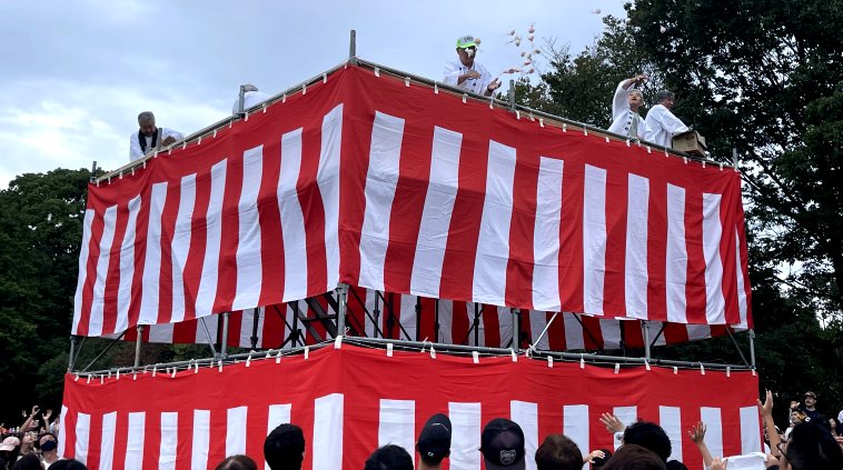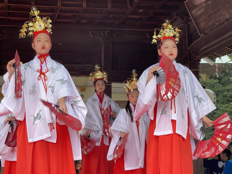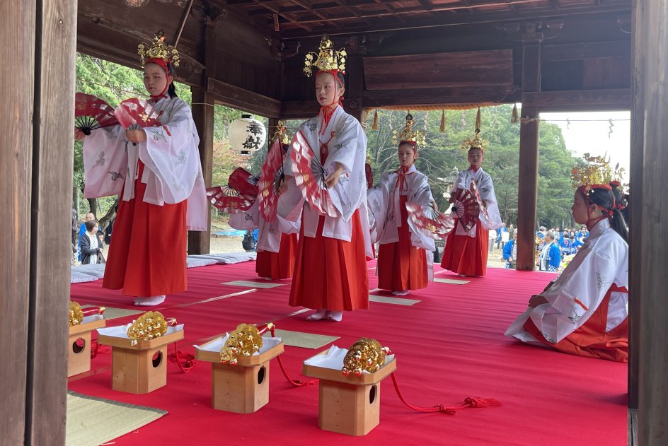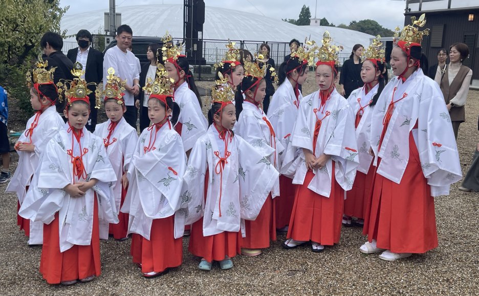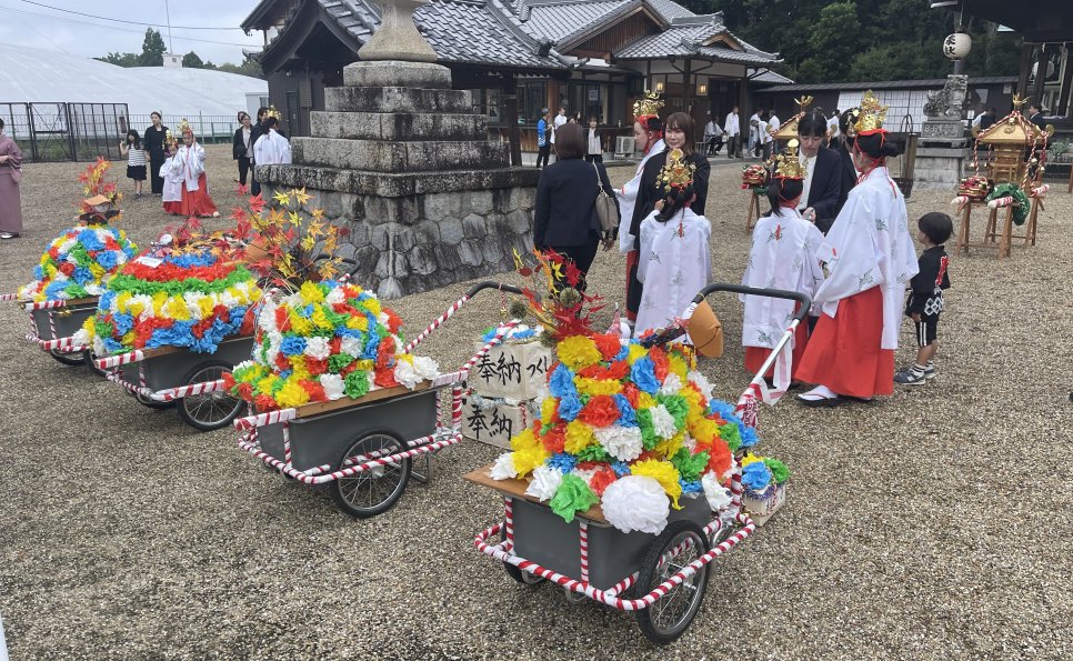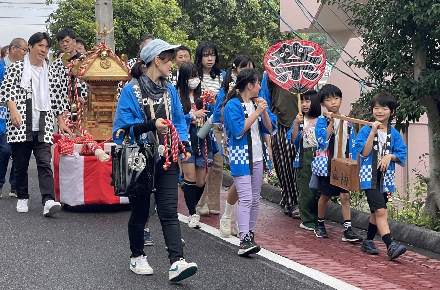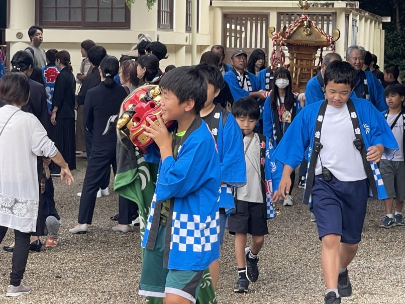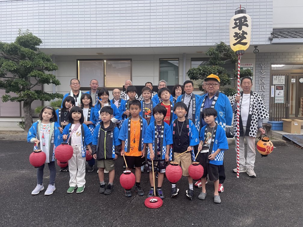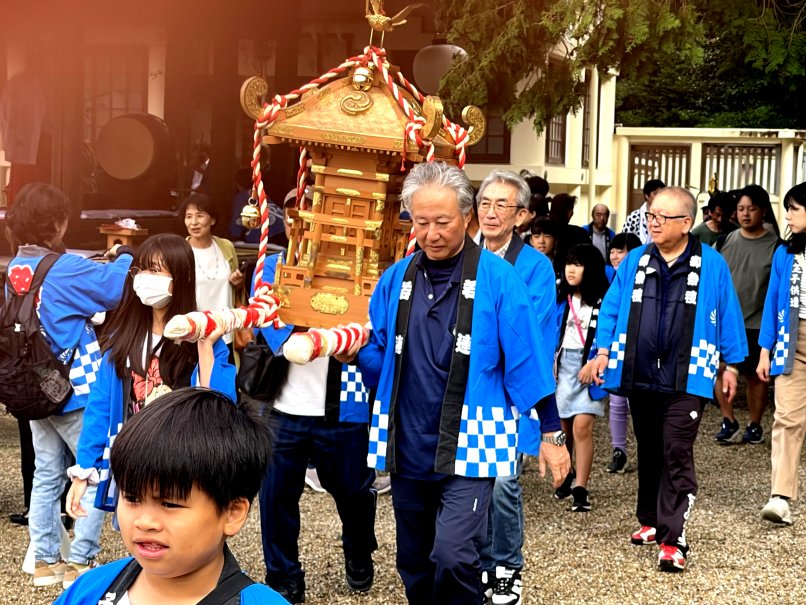 10月11日(土)、12日(日)梅坪神社例大祭が行われました。10月11日(土)には七度参りが行われ、平芝自治区、なじみ会や子ども会の面々が多数参加しましたが、雨交じりの天気の中、子どもたちは七度ならぬ三度参りで終えて帰ってきました。 12日(日)の当日は曇り空のもと、大祭が厳かに執り行われました。大祭では、本殿で神事式典が行われ、巫女舞奉納に続き子供神輿や獅子舞が町内を巡行し、子ども達が賑やかに練り歩きました。 神社では、綿菓子等のキッチンカーが出店、午後には餅投げも行われ、多くの参拝者で賑わっていました。